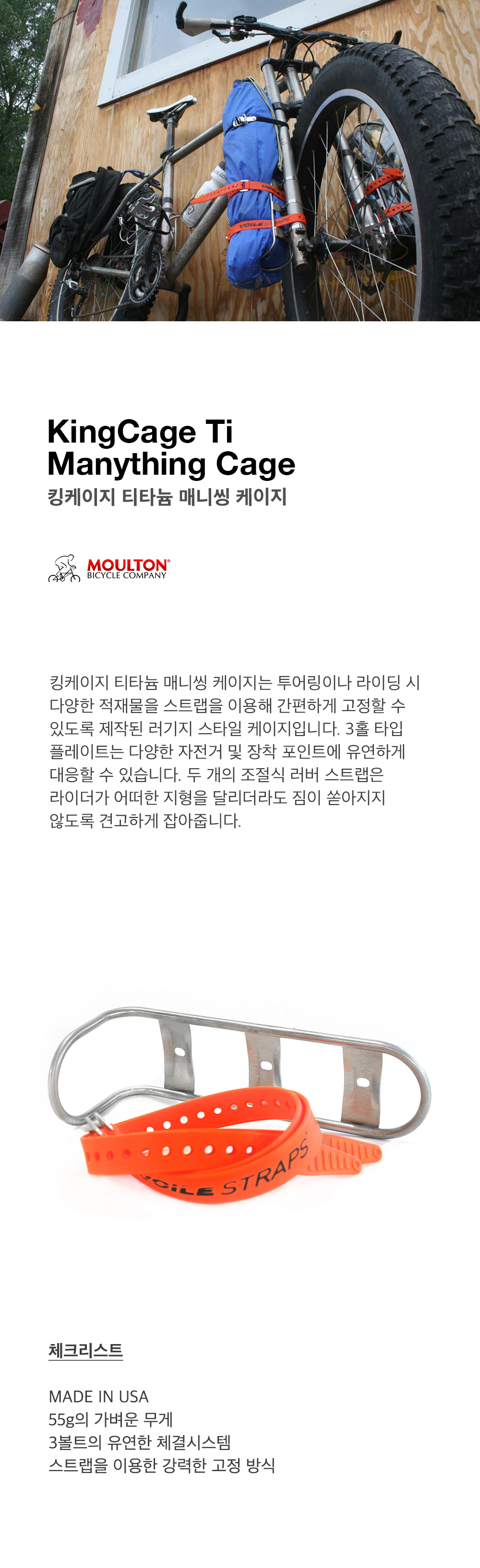 킹케이지 티타늄 매니씽 케이지는 투어링이나 라이딩 시 다양한 적재물을 스트랩을 이용해 간편하게 고정할 수 있도록 제작된 러기지 스타일 케이지입니다. 3홀 타입 플레이트는 다양한 자전거 및 장착 포인트에 유연하게 대응할 수 있습니다. 두 개의 조절식 러버 스트랩은 라이더가 어떠한 지형을 달리더라도 짐이 쏟아지지 않도록 견고하게 잡아줍니다.