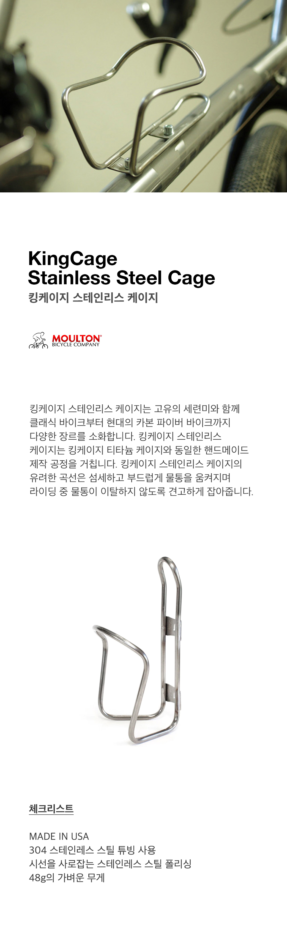 킹케이지 스테인리스 케이지는 고유의 세련미와 함께 클래식 바이크부터 현대의 카본 파이버 바이크까지 다양한 장르를 소화합니다. 킹케이지 스테인리스 케이지는 킹케이지 티타늄 케이지와 동일한 핸드메이드 제작 공정을 거칩니다. 킹케이지 스테인리스 케이지의 유려한 곡선은 섬세하고 부드럽게 물통을 움켜쥐며 라이딩 중 물통이 이탈하지 않도록 견고하게 잡아줍니다.