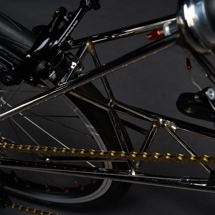 몰튼 스피드는 마치 카본 로드 바이크처럼 프레임이 하나의 덩어리를 이룹니다. 치밀하게 연결된 스페이스 프레임이 로드바이크 수준의 강성을 만들어내며 그레이하운드의 단단한 몸체가 됩니다. 몰튼 스피드의 뛰어난 강성과 구조는 라이더의 힘을 고스란히 노면으로 전달하는 시작지점입니다.