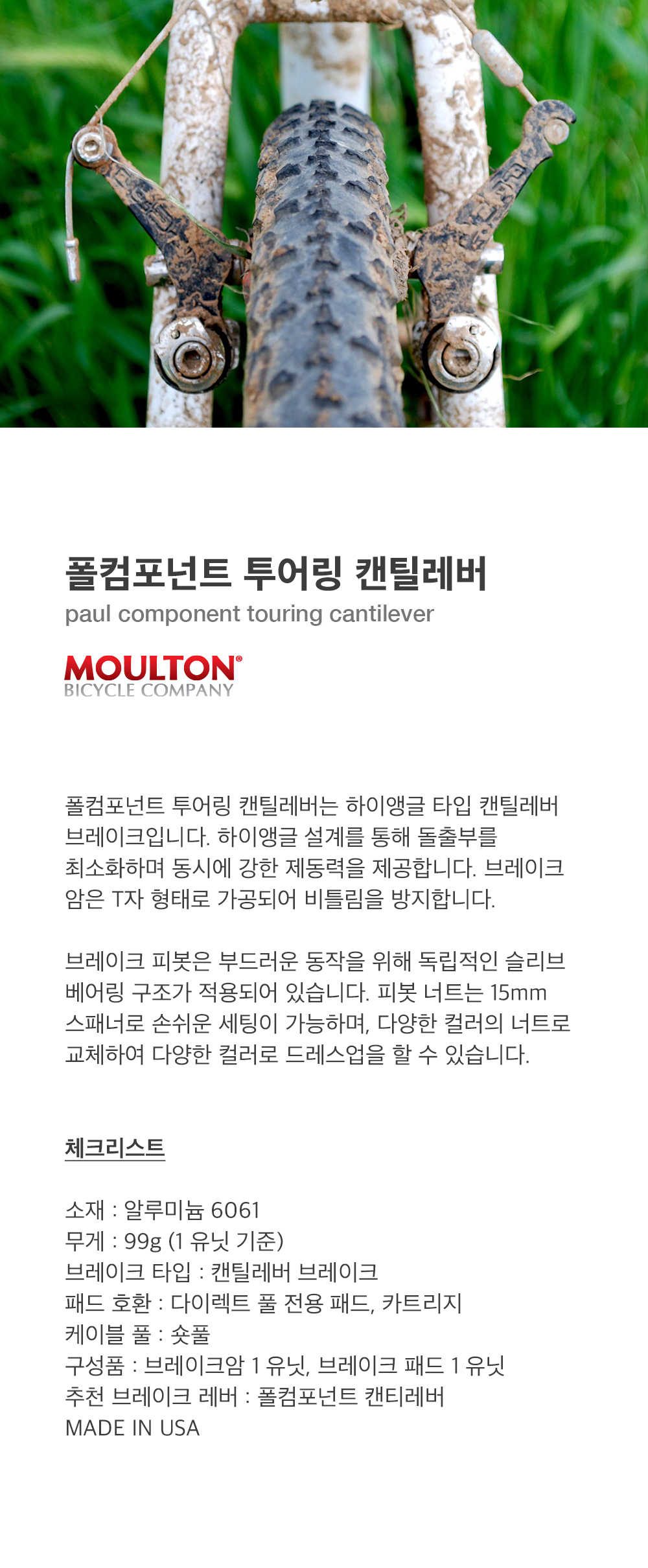 폴컴포넌트 투어링 캔틸레버는 하이앵글 타입 캔틸레버 브레이크입니다. 하이앵글 설계를 통해 돌출부를 최소화하며 동시에 강한 제동력을 제공합니다. 브레이크 암은 T자 형태로 가공되어 비틀림을 방지합니다.