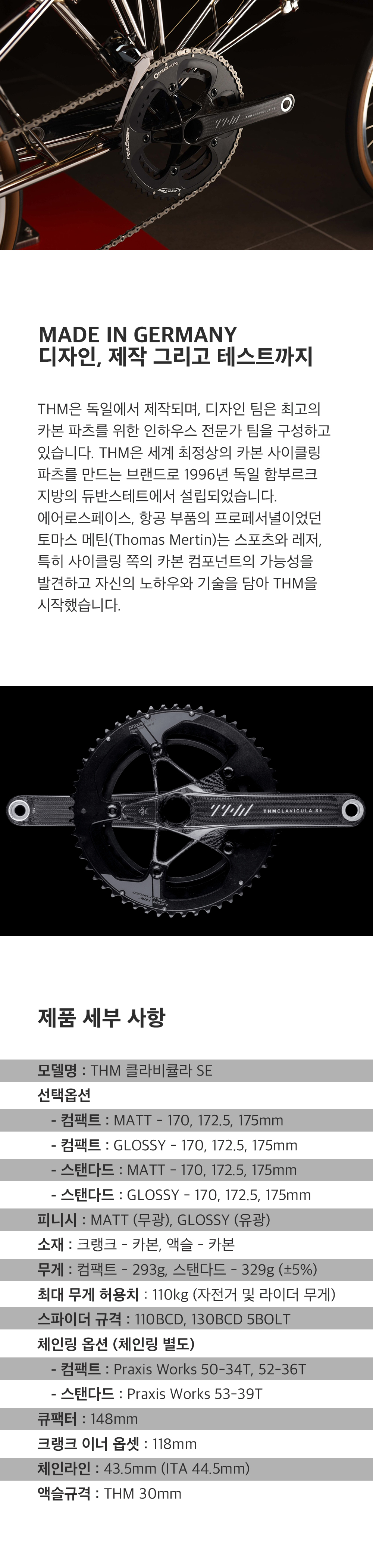 THM 클라비큘라 SE는 소재와 구조를 극한으로 밀어붙인 카본 크랭크셋의 정점입니다. 아름다운 구조물은 시각적으로도 기술적으로도 극적인 만족감을 선사하며, 가벼운 무게에서 오는 경쾌한 움직임은 라이더에게 놀라운 퍼포먼스를 선사합니다.