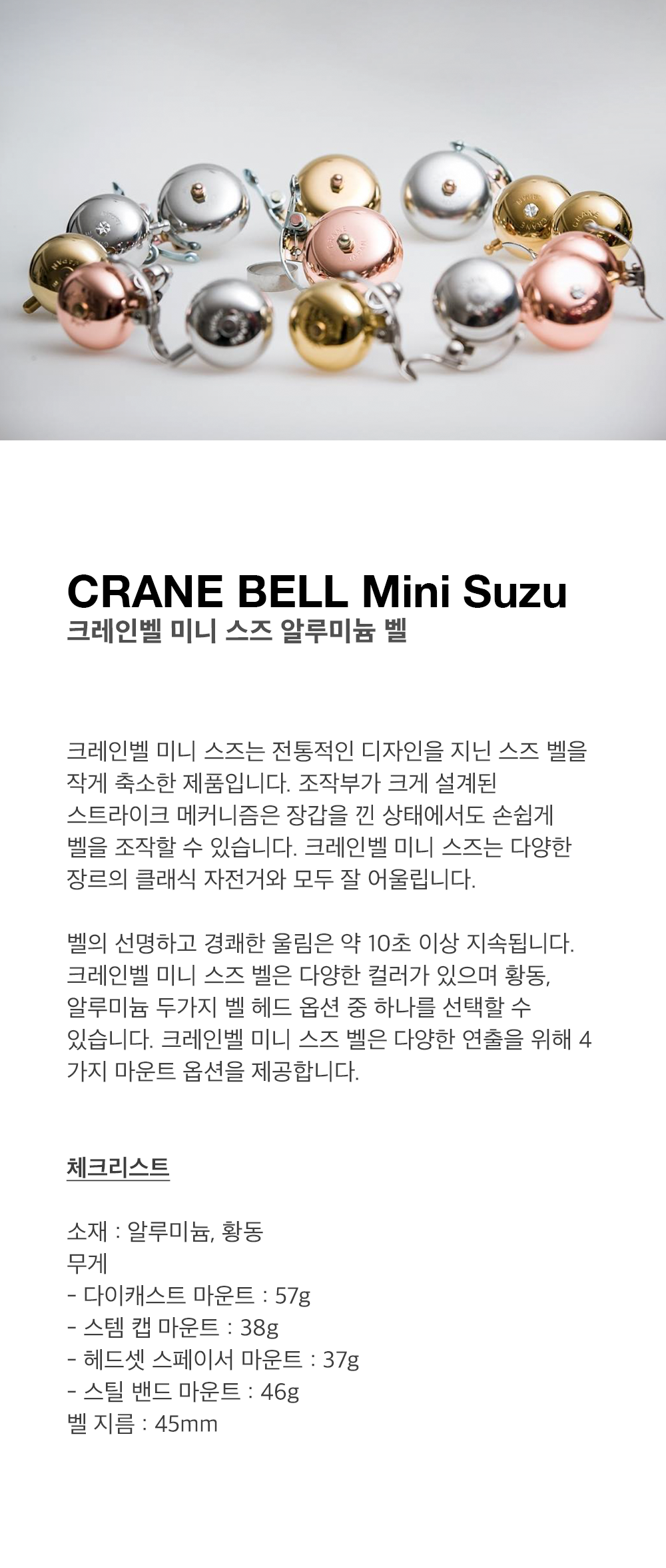 크레인벨 미니 스즈는 전통적인 디자인을 지닌 스즈 벨을 작게 축소한 제품입니다. 조작부가 크게 설계된 스트라이크 메커니즘은 장갑을 낀 상태에서도 손쉽게 벨을 조작할 수 있습니다. 크레인벨 미니 스즈는 다양한 장르의 클래식 자전거와 모두 잘 어울립니다.